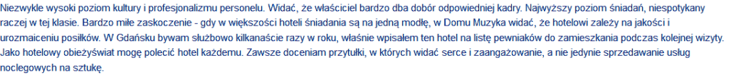 Dodatkowo, jeśli chodzi o śniadania, właściciele obiektów lub zarządzający nimi, na wieść o tym, że piszę rozbudowane recenzje, często sami zapraszają mnie na śniadania, aby moja recenzja była pełna. Gdyż jakość śniadania często może przechylić ocenę w jedną lub drugą stronę. Przykład – również z miasta Gdańsk – możecie przeczytać na portalu rezerwacyjnym, za pomocą którego dokonywałem rezerwacji w Domu Muzyka: