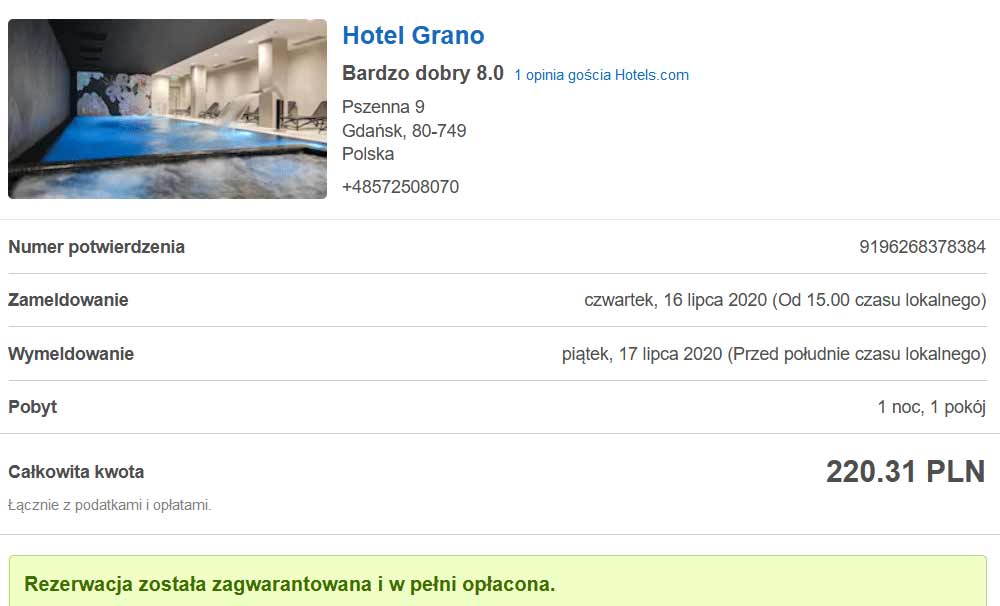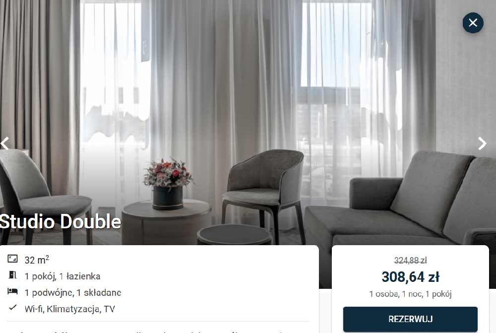 Jednakże, korzystając z systemów rezerwacyjnych, można ją sporo zredukować. W moim przypadku o prawie 90 zł. Taką korzystną ofertę zaproponował mi portal hotels.com – jeden z wykorzystywanych przeze mnie w wyszukiwaniu atrakcyjnych ofert noclegów: