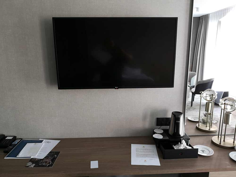 Pokój wyposażony jest w tzw. kącik kawowy (z wyposażeniem bardzo minimalistycznym, jeśli chodzi o ofertę kaw i herbat – takie absolutne minimum, a szkoda) oraz niewielką lodówkę. Telewizor. Ja nie korzystam, ale zwracam uwagę na ten sprzęt, gdyż wybór marki świadczy o tym, czy hotel idzie w jakość czy bylejakość. I faktem jest że często w hotelach znaleźć można niezwykle niskobudżetowe marki. Niektóre kompletnie nieznane. Hotel Grano oferuje swoim gościom taki telewizor: