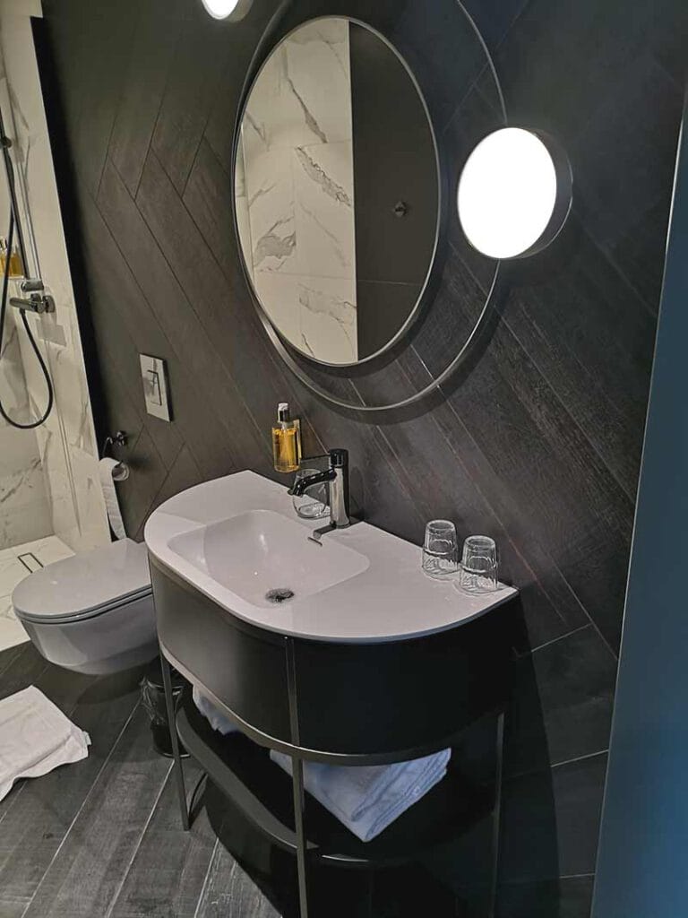 Łazienka w hotelu to ten element, na który zwracają uwagę szczególnie kobiety. W hotelu Grano – póki co – rozczarują się one w kwestii detali. Gdyż w innych jest bardzo dobrze. Mam na myśli wygląd, czystość, rozplanowanie, funkcjonalność. Zdjęcia – mówię szczerze – nie oddają urody tego elementu. Łazienka jest naprawdę ładna, a oryginalny system oświetlenia pozwoli stworzyć w niej nastrój. Jest naprawdę miło: